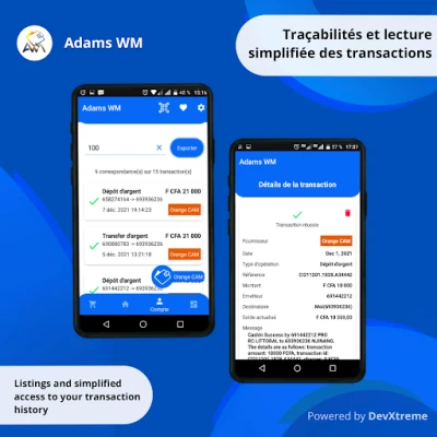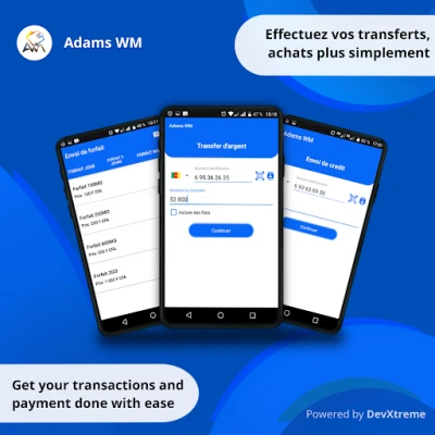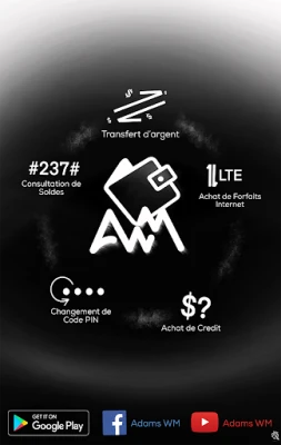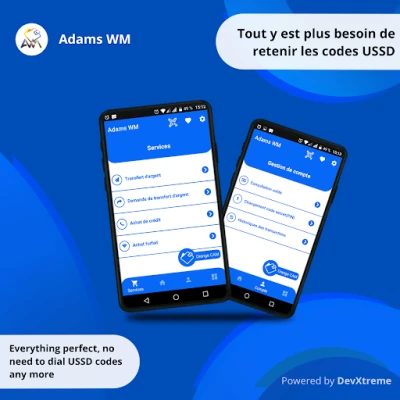 Créé pour les utilisateurs de services de paiements électroniques via code USSD (séquence de chiffres, d’étoile (*) et de dièse (#)), Adams WM est un assistant personnel qui vous permettra d’initier vos différentes transactions, chez plusieurs opérateurs/fournisseurs différents (Orange Money, Mtn Mobile Money, etc...), simplement et rapide en formatant et exécutant de façon automatique les codes USSD de vos transactions courantes :