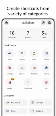 Quikshort lets you create shortcuts on homescreen, tiles in quick settings and also provides a functionality to group the shortcuts that you have created.