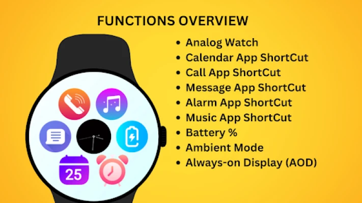 Enhance your Wear OS experience with the Watch Shortcuts - Watch Face! Get quick and easy access to essential apps like Phone, Music, Messages, Calendar, Alarm, and Battery Status, all with a single tap from your watch face.